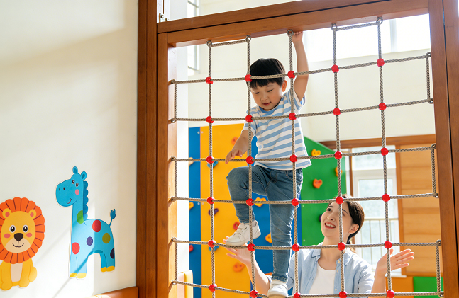 障碍路线叙事:设置简单的家庭障碍路线(爬过枕头山、跳过地板“河流”),孩子完成每个动作时,父母帮助用语言描述:“我现在在爬过高山!”“我成功跳过河流!”将动作体验转化为语言表达。