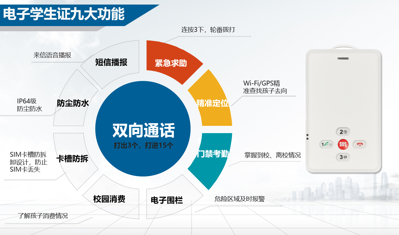 智能电子学生证是为智慧校园、安全校园量身定做的智能电子学生证,它没有任何的电子屏,将校园一卡通、通讯功能合为一体,学生可以使用语音通话一键联系家长、发出紧急求救,还可以用于考勤、校园消费,进出学校时,家长会收到孩子的到校、离校通知,可以利用WIFI、GPS定位知道孩子的位置信息,当孩子进入划定好的危险区域时,家长会立即收到报警。该款学生证符合国家认证,能够充分满足家长、学生、老师的需求。